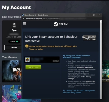 Кросс прогресс подключается крайне просто. Для начала необходимо хотя бы один раз зайти в игру через каждый лаунчер, который нужно привязать, далее листай карусель. Заходим на сайт bhvr.com, авторизуемся всеми нужными способами (их 2) Вуаля зелёные огонёчки значат, что связка завершена.